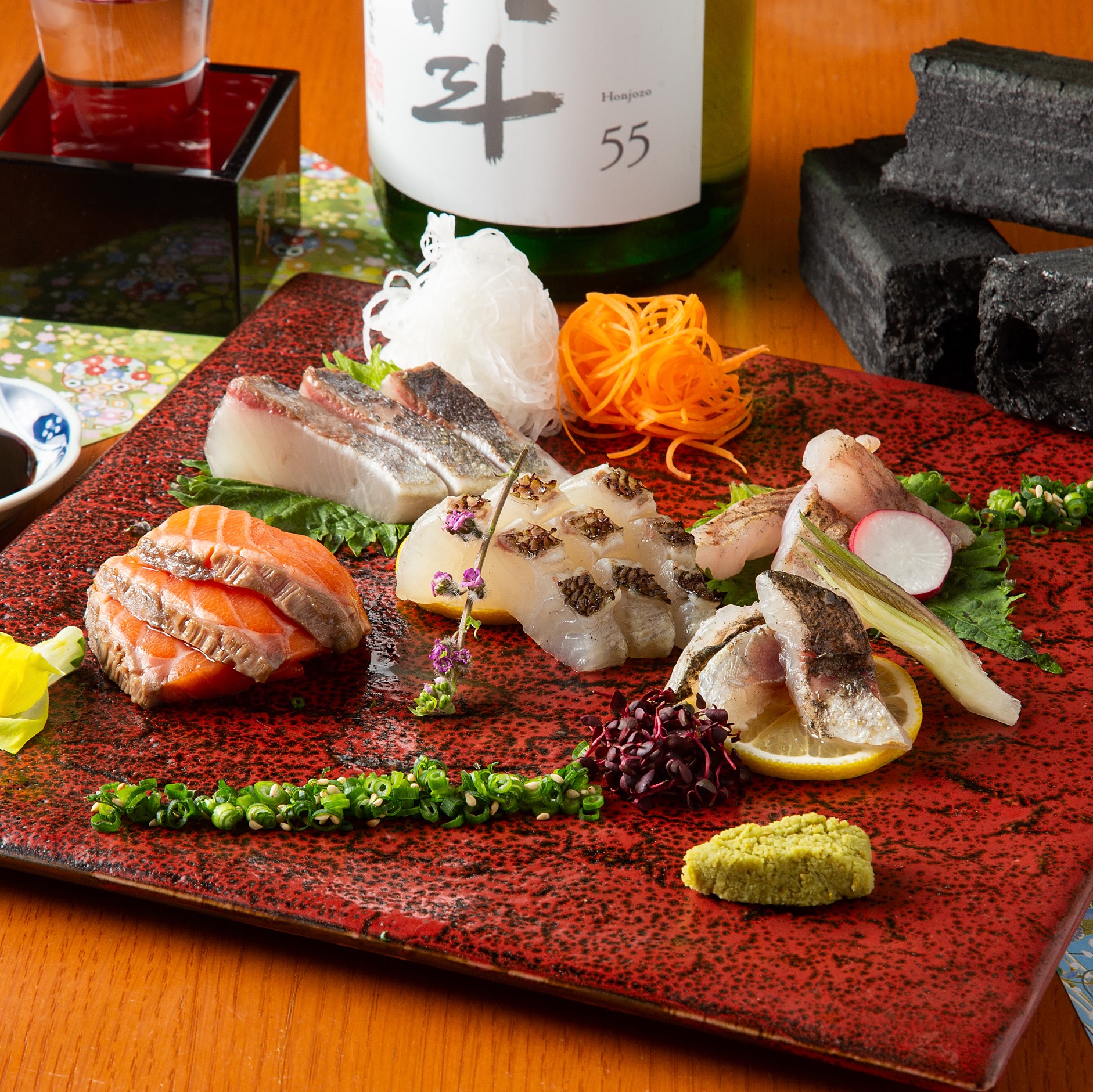 当店名物の炭の香りがする炙り刺し。必食メニュー