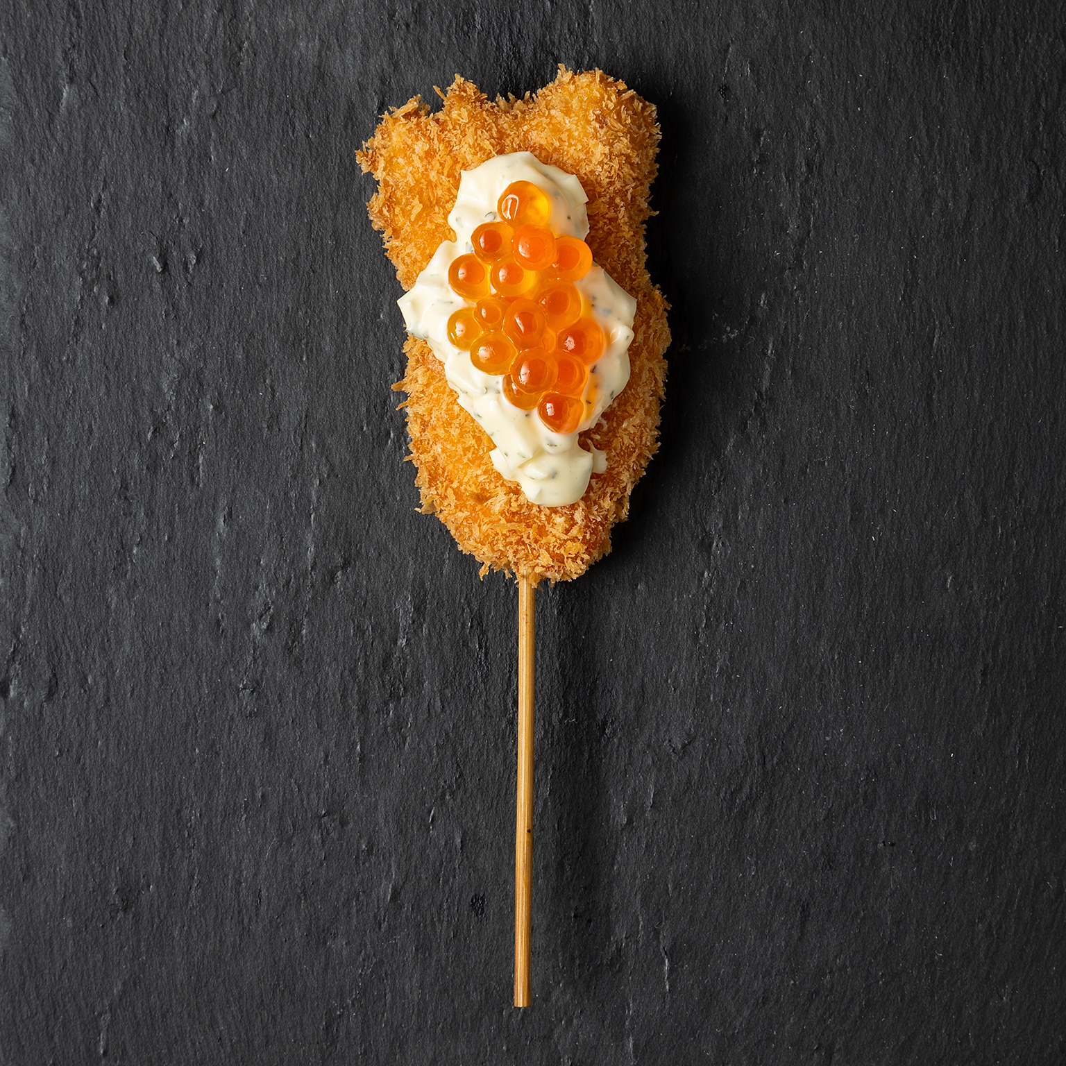 とろけるサーモンとクリーミーなタルタルソース、イクラを贅沢に合わせた親子串。