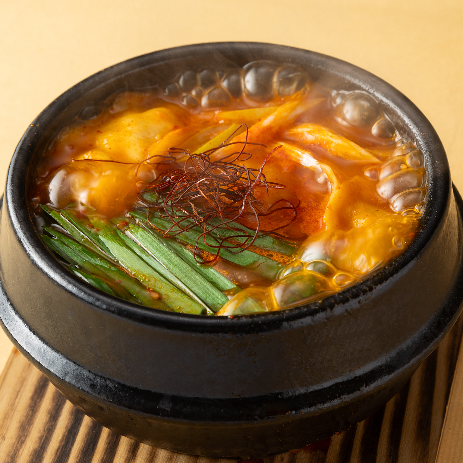 ぷりぷりのもつと豆腐をたっぷり使った、コク深いもつチゲ。ピリ辛のスープが具材の旨味を引き立て、体の芯から温まる一品です。