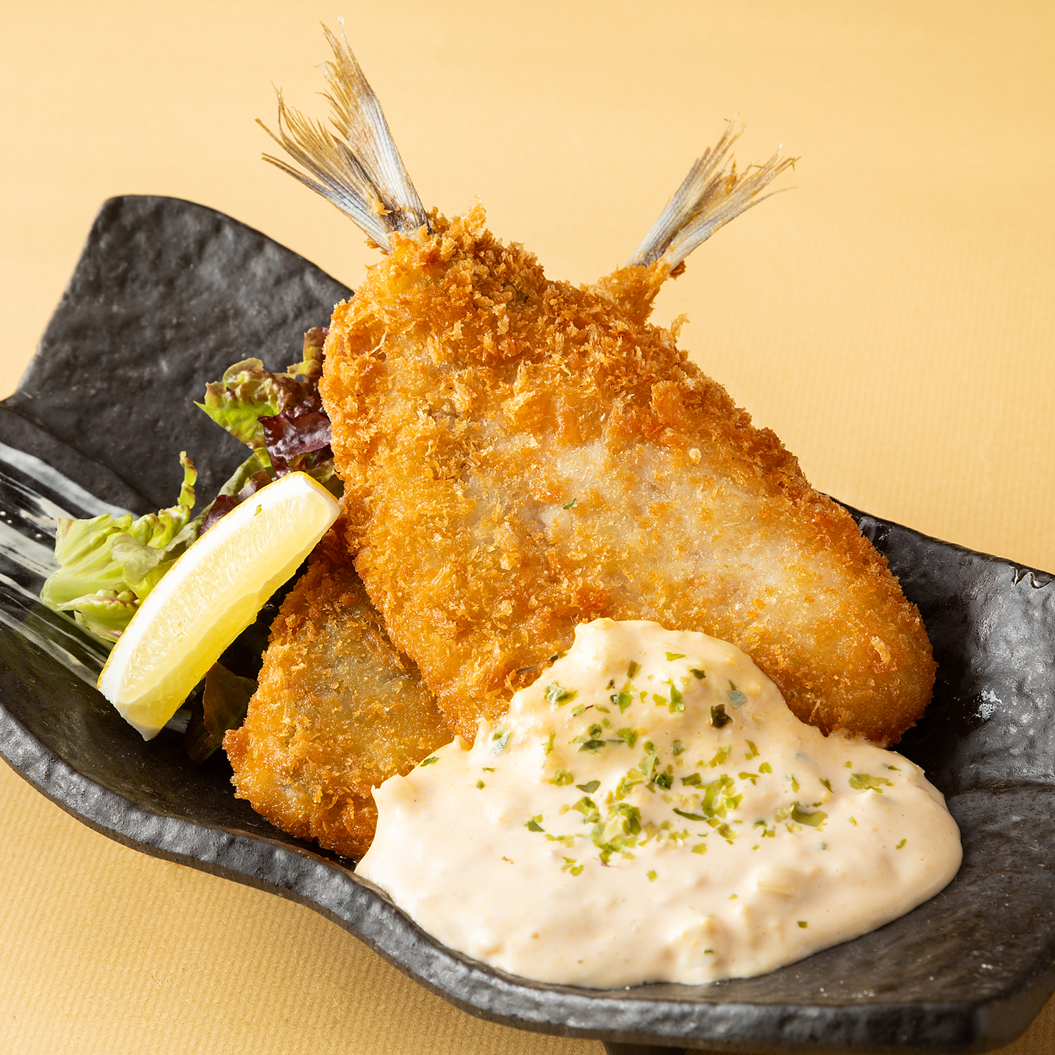 長崎松浦産の新鮮なアジを使った、サクサクのアジフライ。外はカリッと揚がり、中はふんわりとした身がしっとりとジューシー。豊かな海の恵みを感じる味わいで、特製ソースやレモンを添えて、さらに美味しさが引き立ちます。