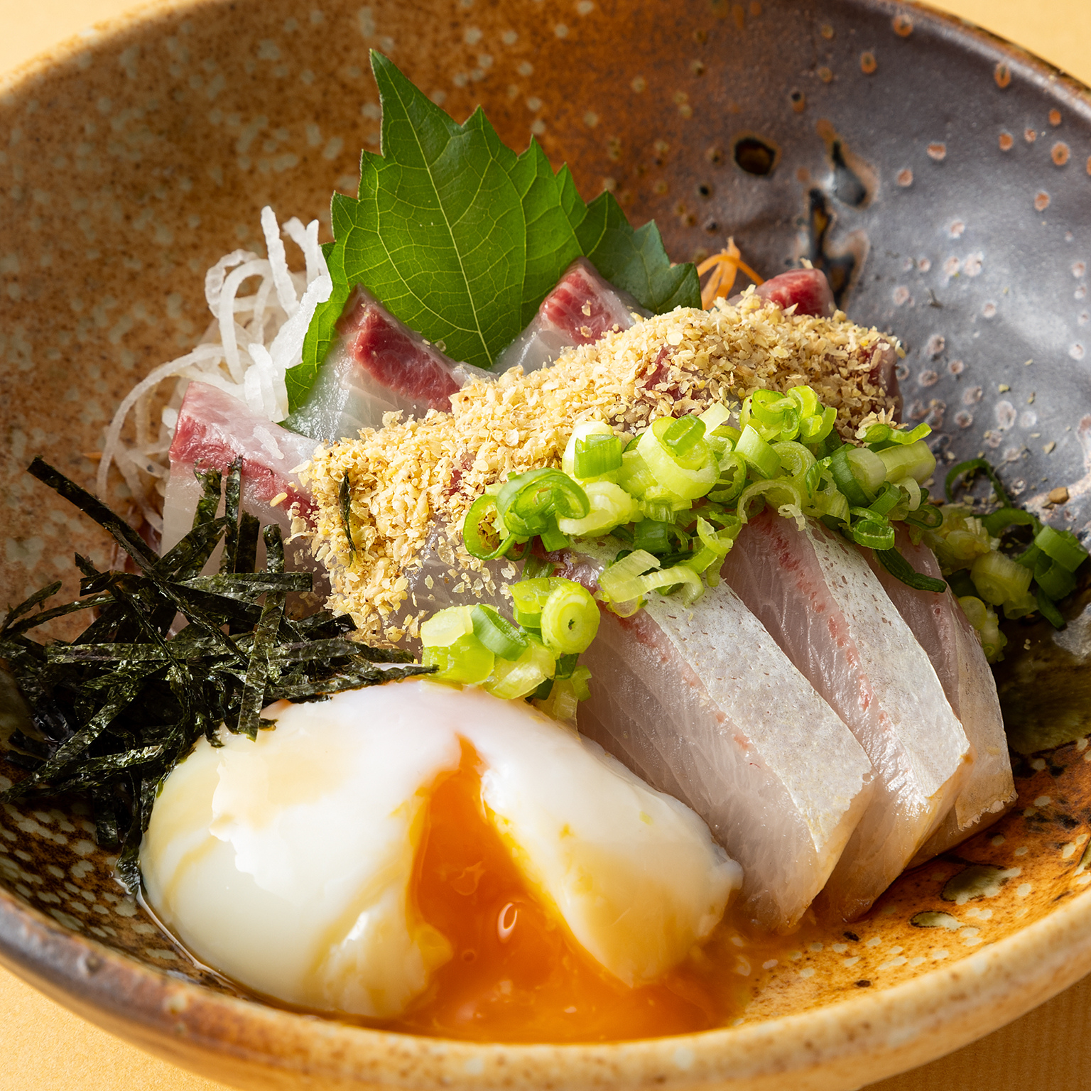 濃厚な胡麻醤油がヒラスに絡んで最上の酒の肴に生まれ変わります。温泉卵が絡んでたまりません!
