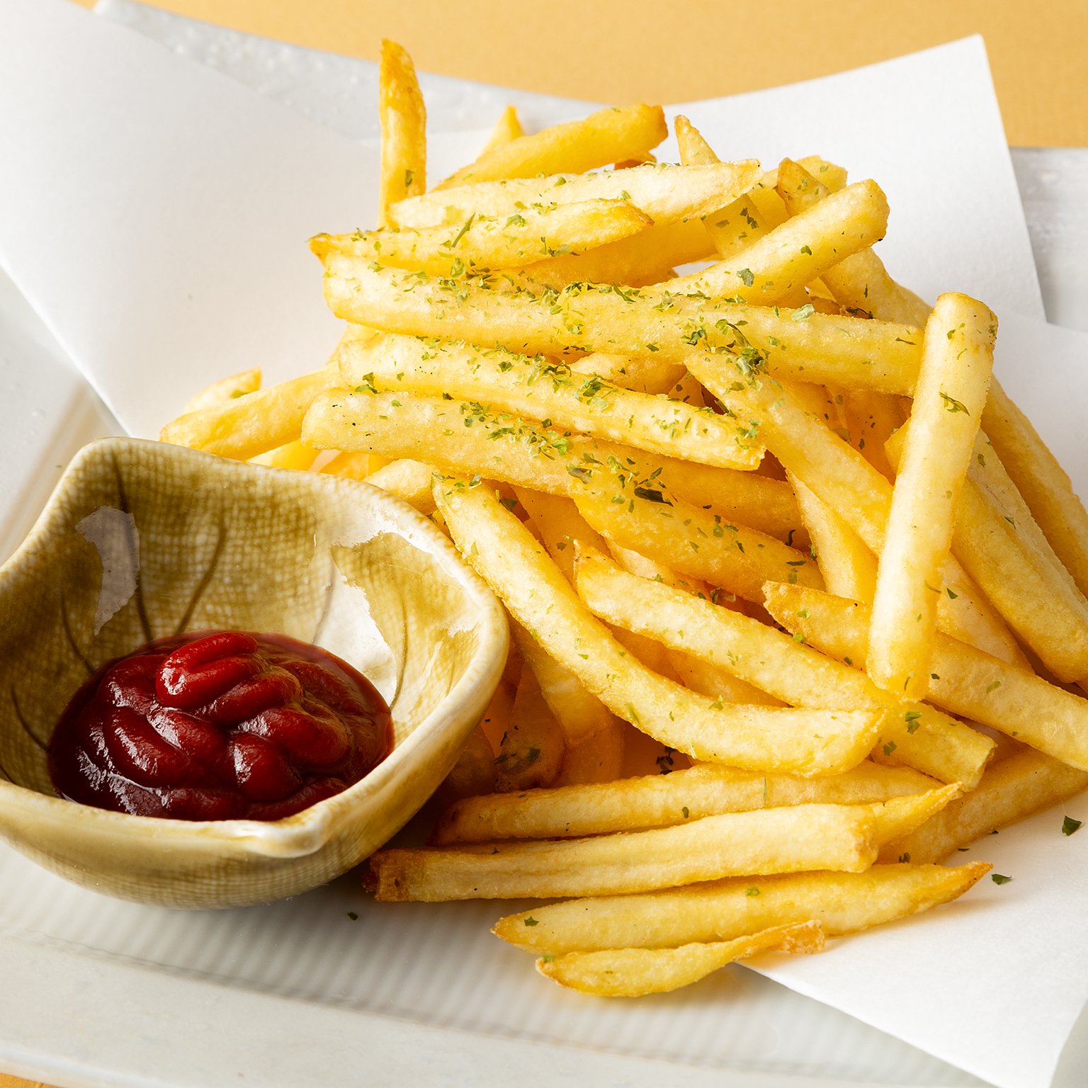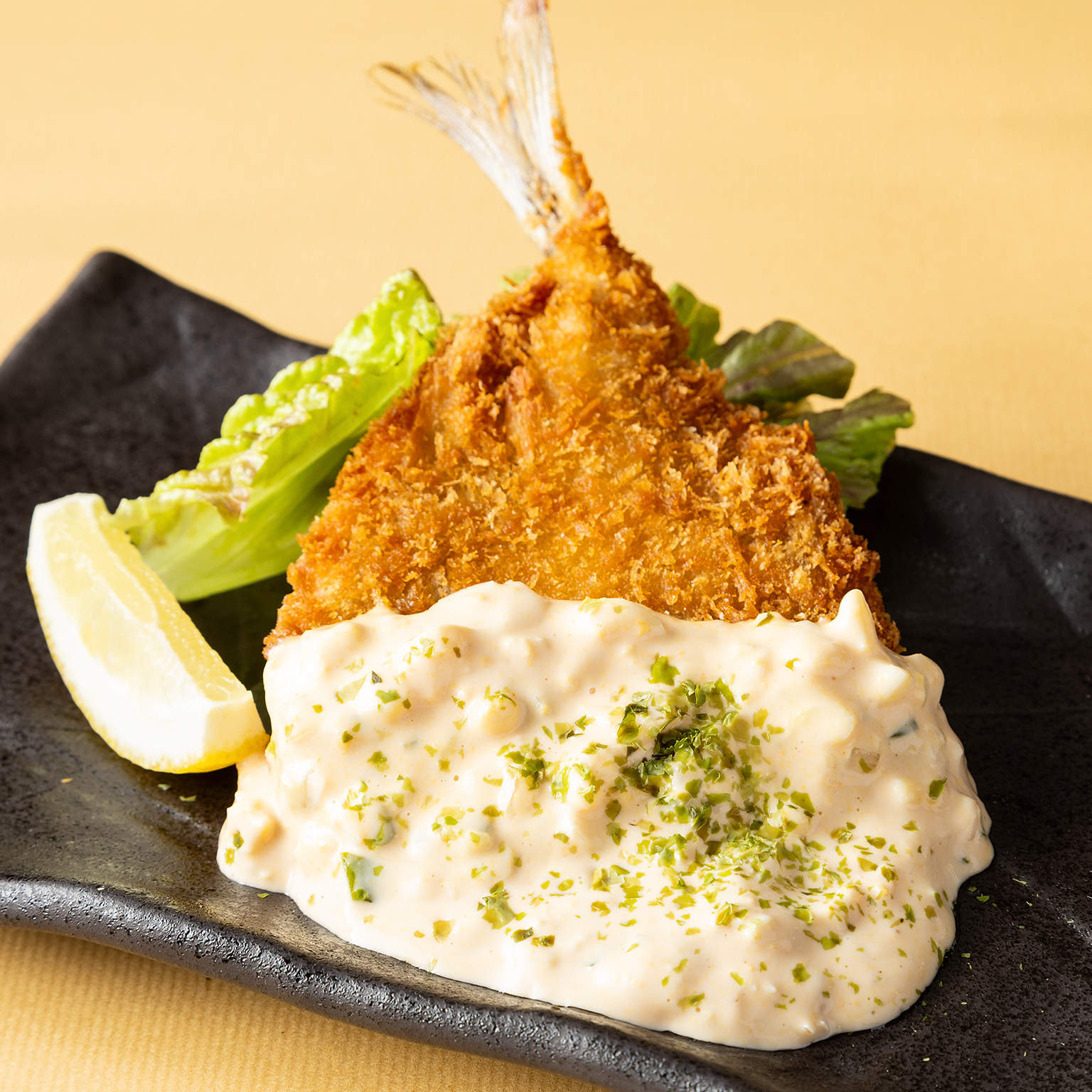 長崎松浦産の新鮮なアジを使った、サクサクのアジフライ。外はカリッと揚がり、中はふんわりとした身がしっとりとジューシー。豊かな海の恵みを感じる味わいで、特製ソースやレモンを添えて、さらに美味しさが引き立ちます。