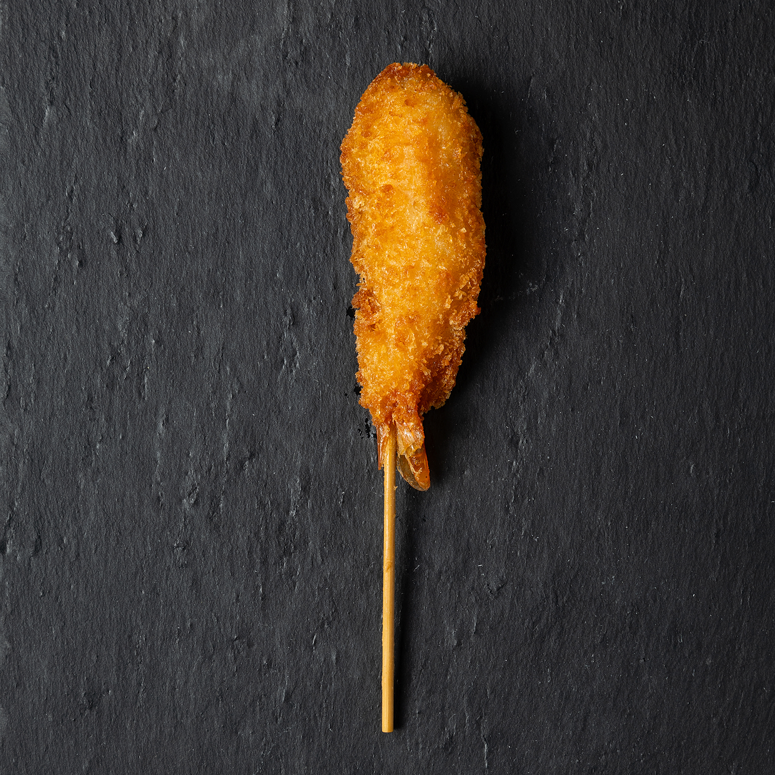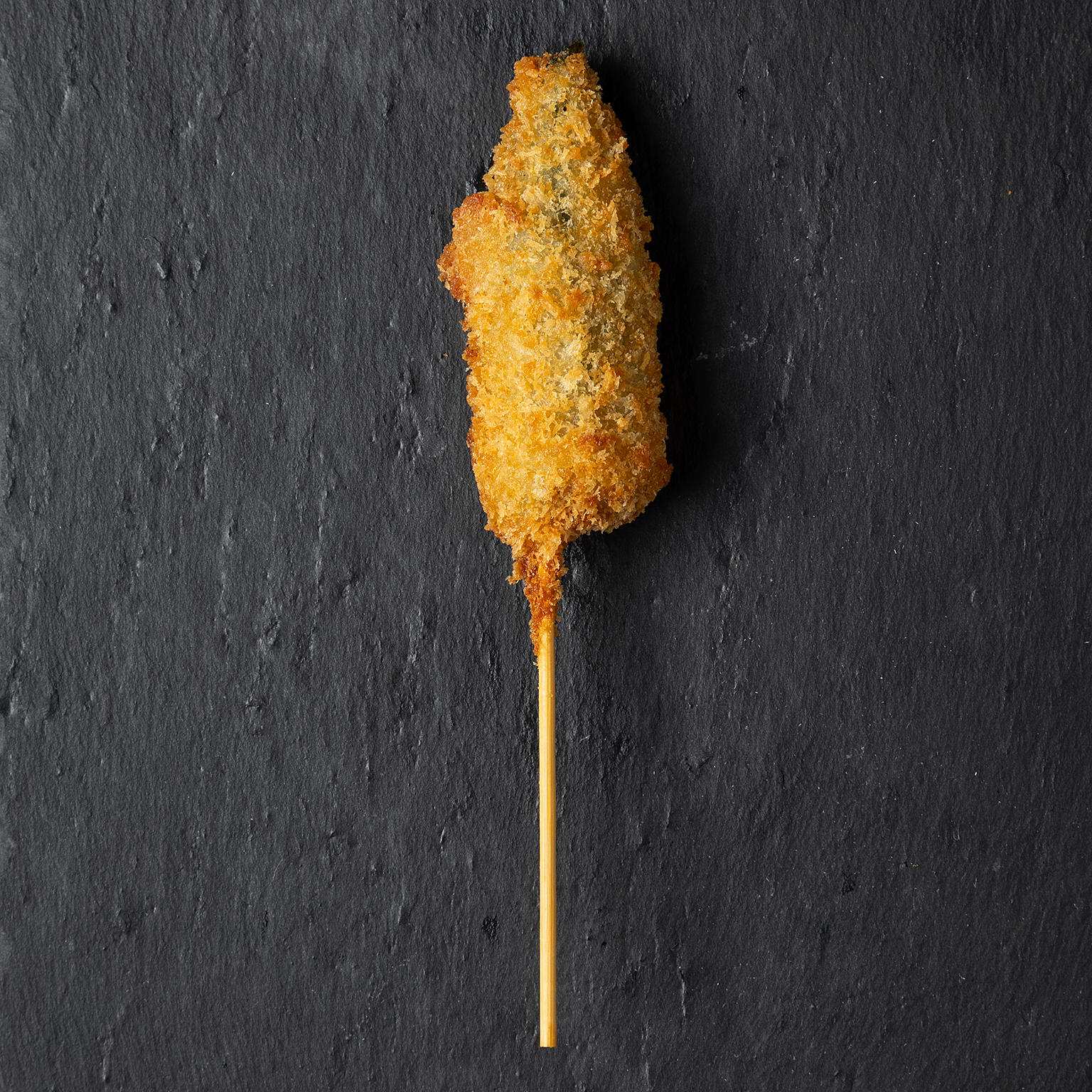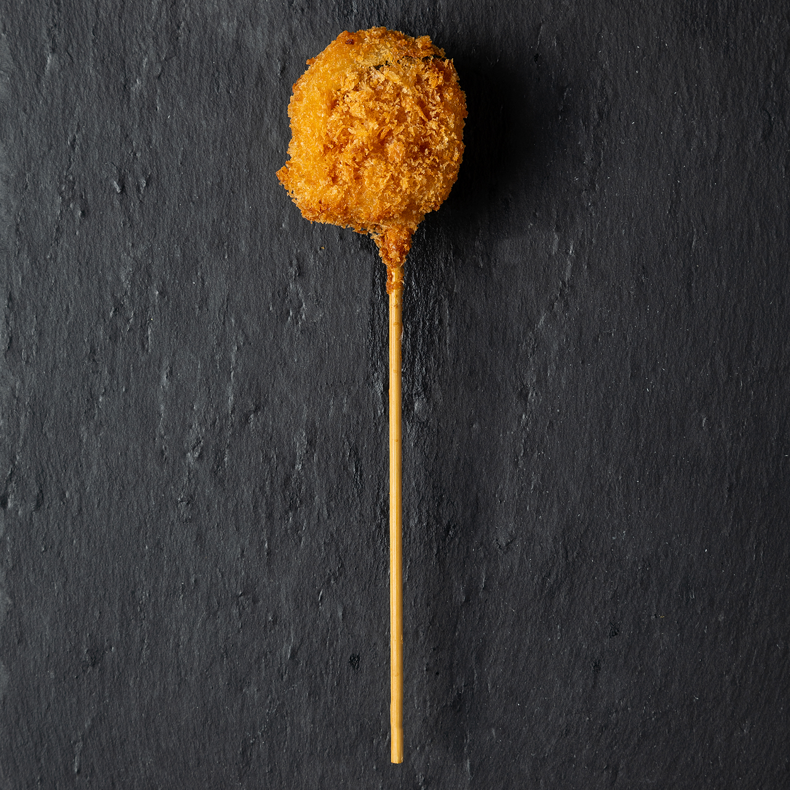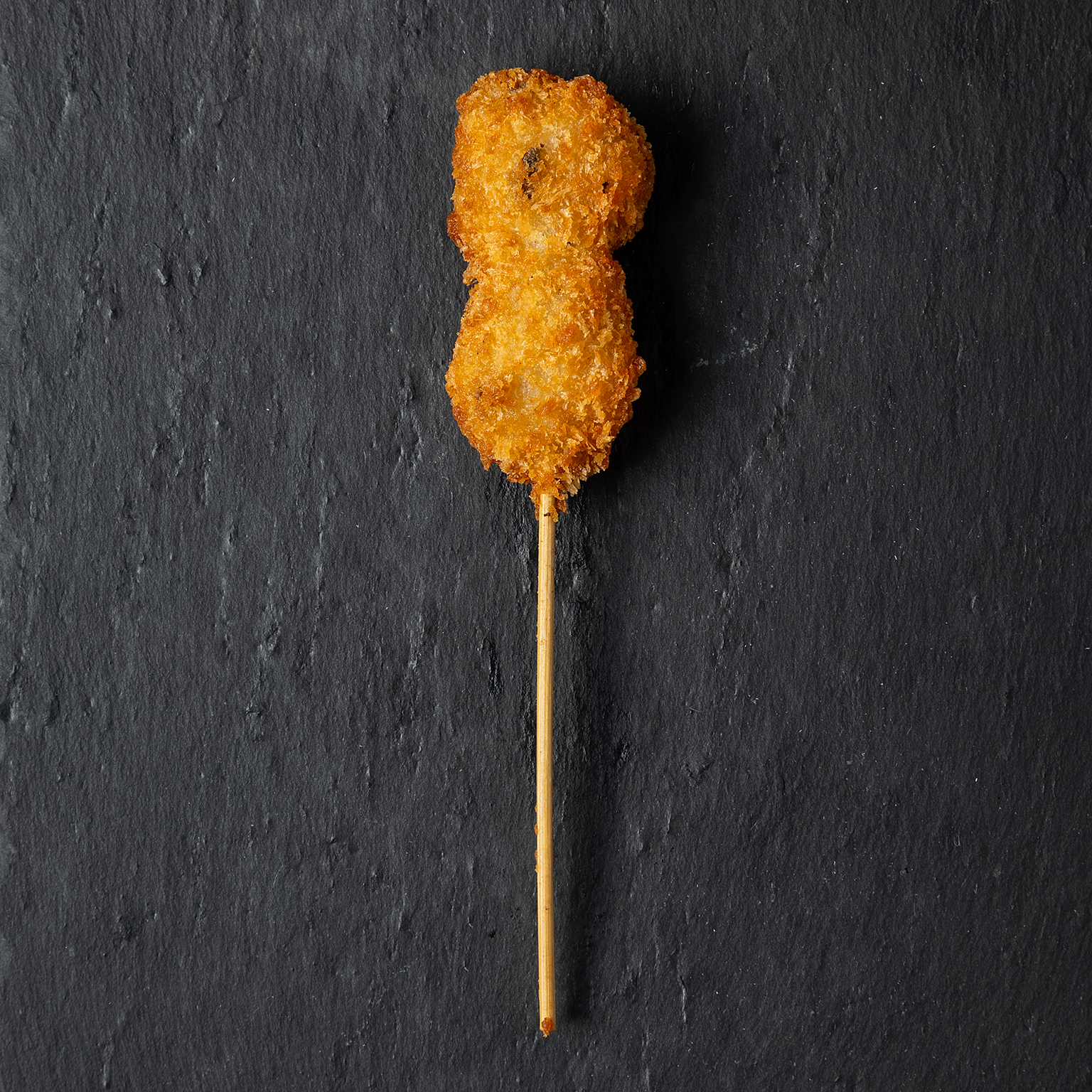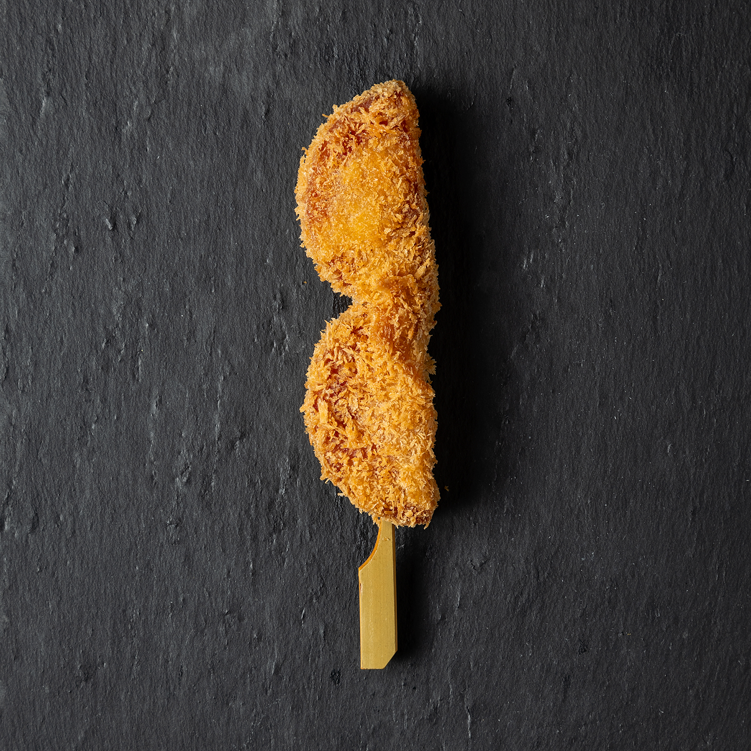 甘みたっぷりのかぼちゃをサクサクの衣で包んだ、ホクホク感が楽しめる串揚げ。外はカリッと香ばしく、中はクリーミーでほっこりとした味わいが広がります。
