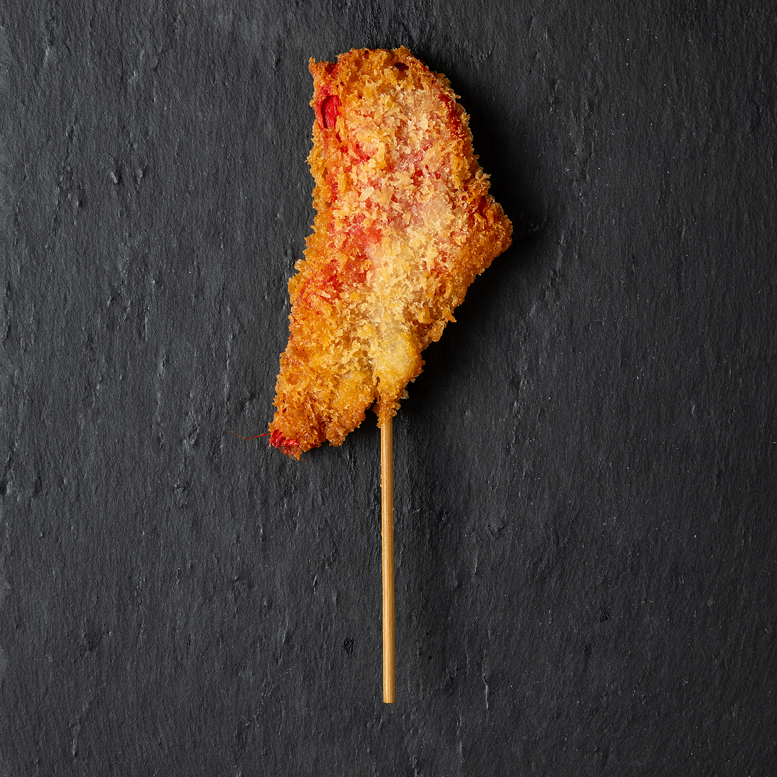 ピリッとした辛みと香ばしさが特徴の紅しょうがを、サクサクの衣で包んだユニークな串揚げ。外はカリッと、中はしっとりとした食感が楽しめ、ほんのりとした酸味が食欲を刺激します。