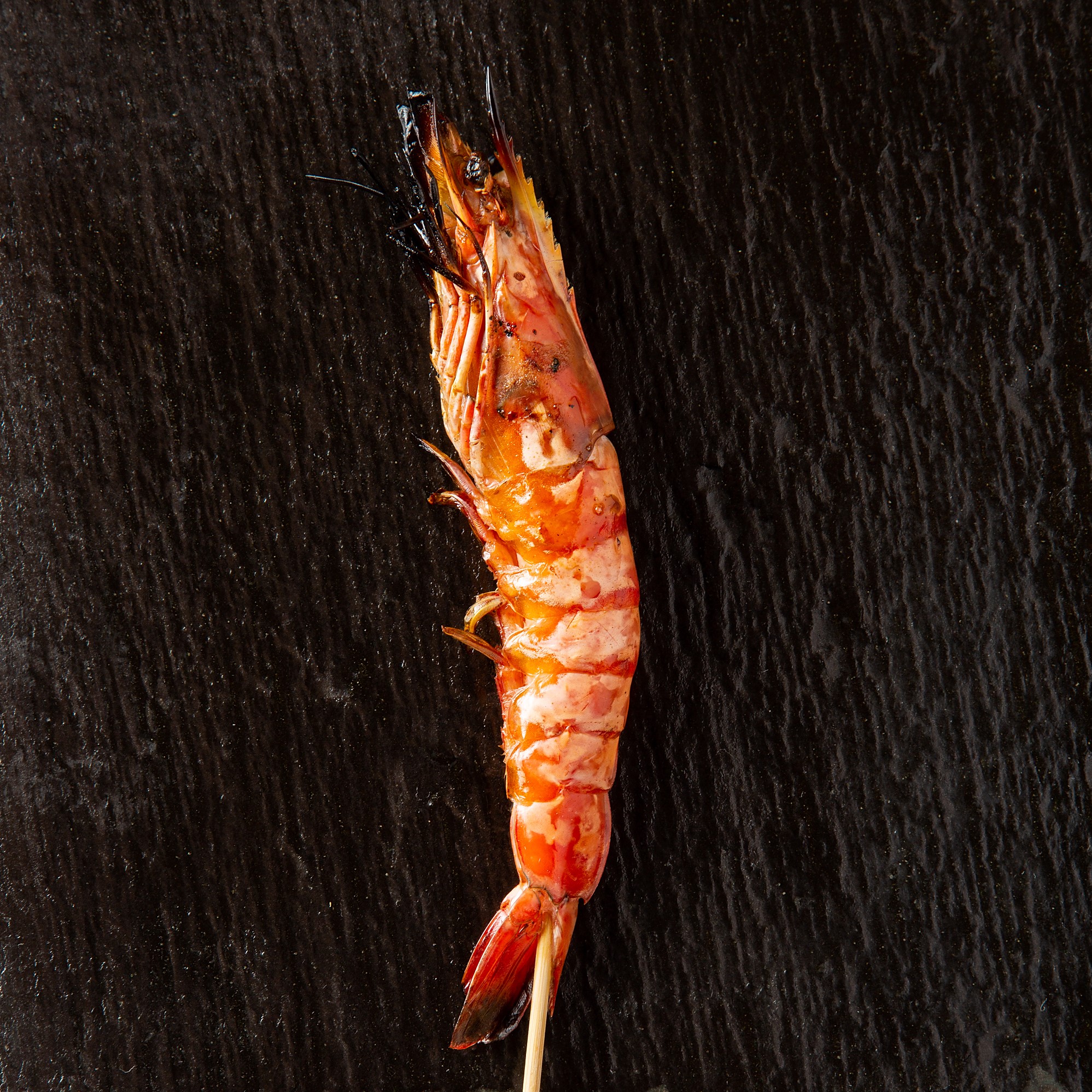 プリプリのえびを豪快に串焼きにした一品。ジューシーな旨味が口いっぱいに広がり、香ばしい香りが食欲をそそります。