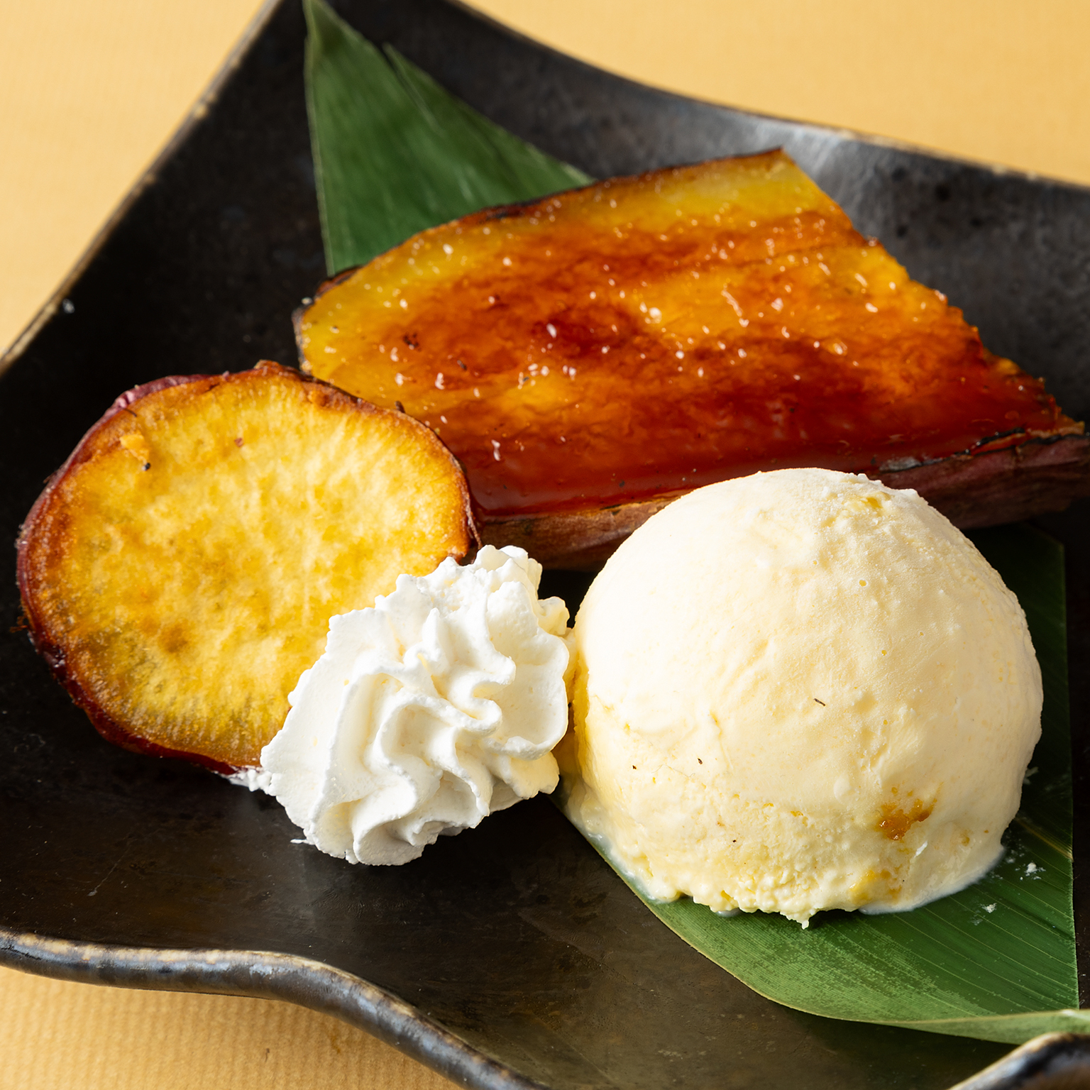 ほっくりと甘いさつまいもブリュレに、滑らかなバニラアイスを添えた贅沢なデザート。
